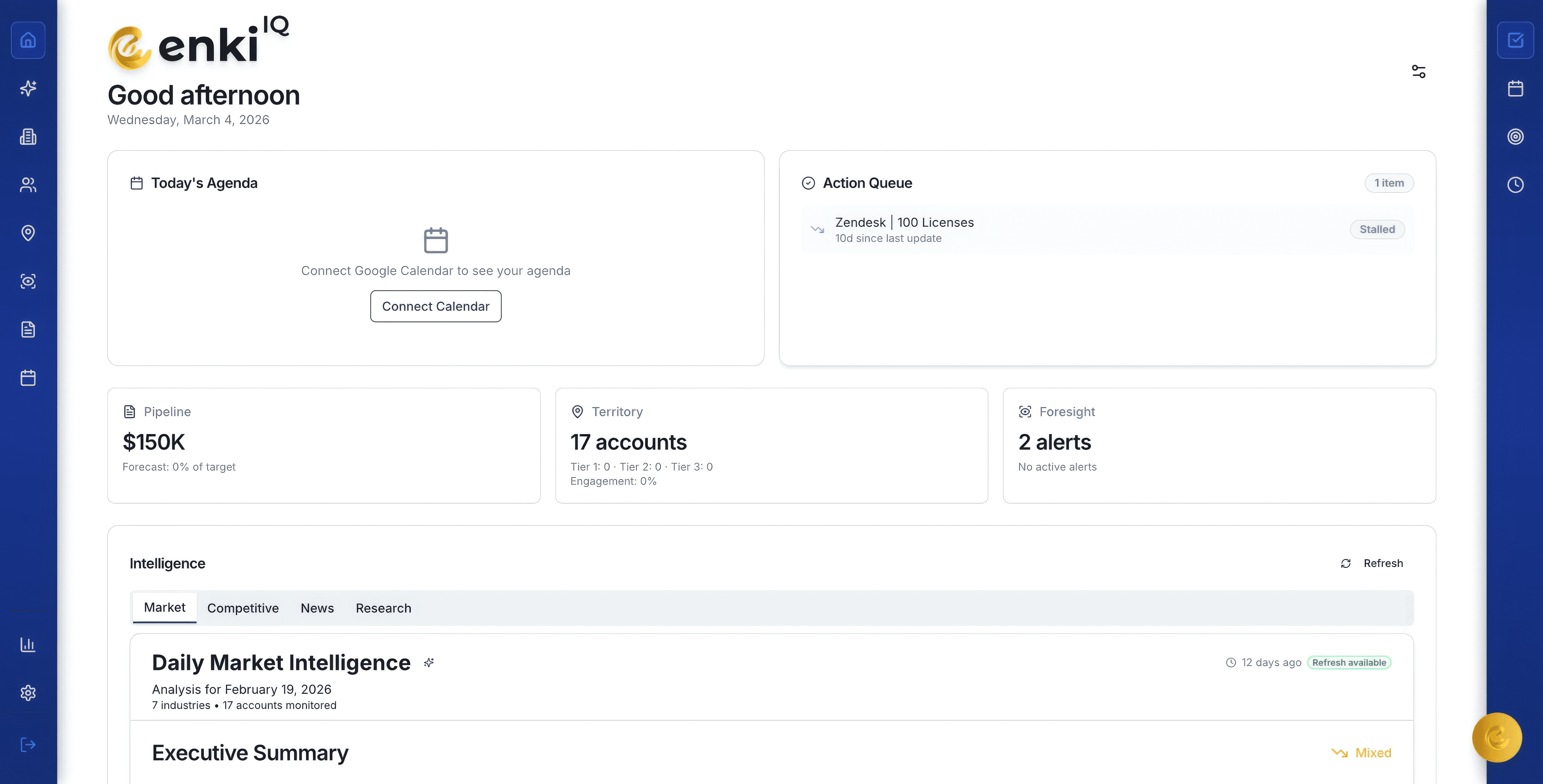 A smart dashboard with today's priorities, quick access to accounts, contacts, opportunities, and tasks — plus tabbed intelligence panels for territory insights, pipeline health, and market news.