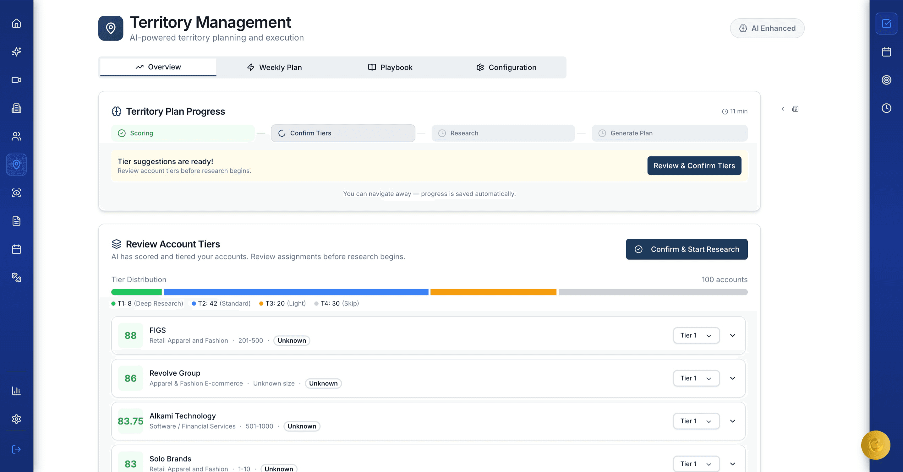 Weekly AI-generated outreach plans that prioritize accounts and contacts, draft personalized messages, and adapt to your pipeline in real time. Stop guessing who to call — let the AI rank it.