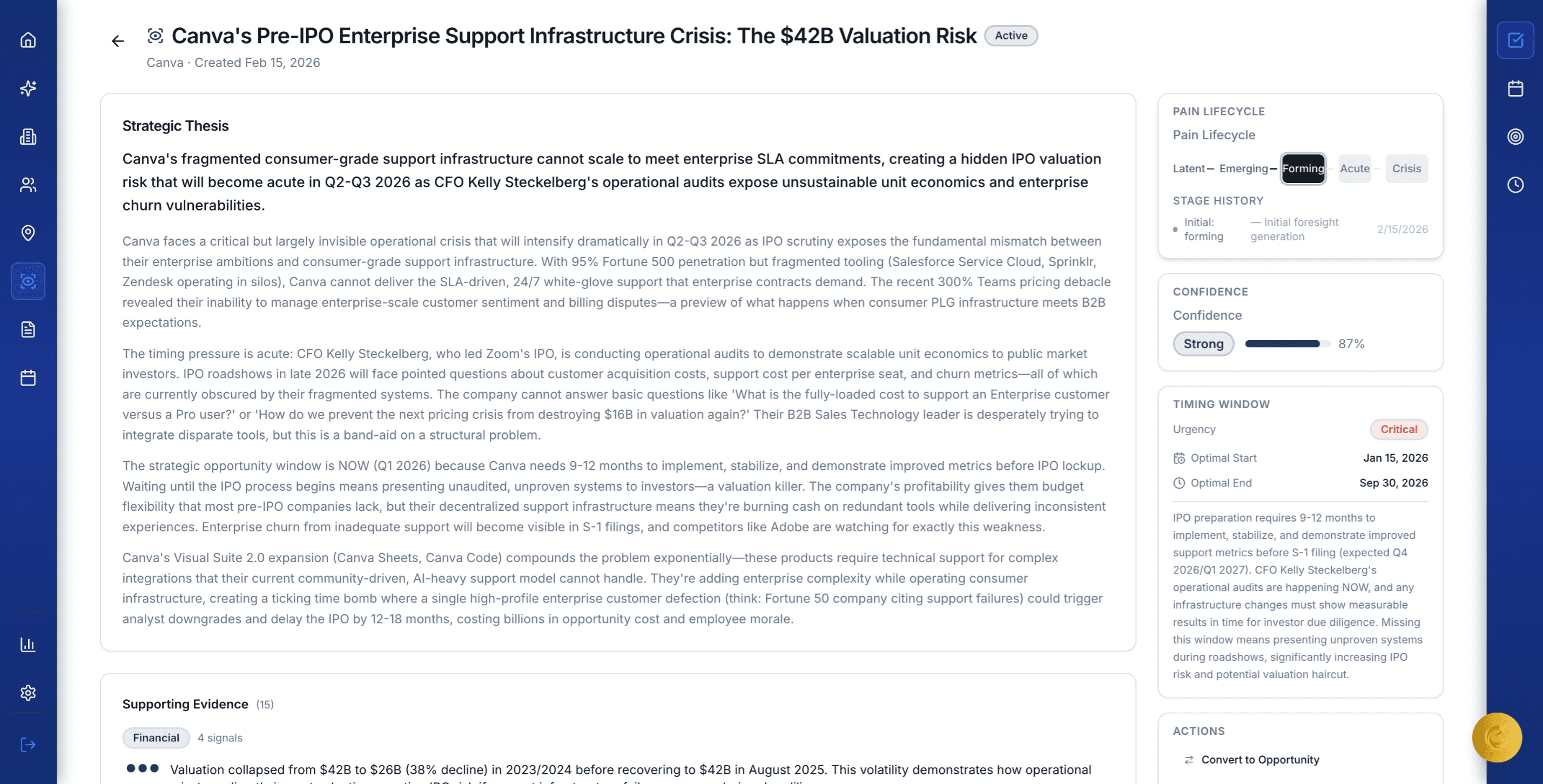 Financial signals, hiring moves, tech stack changes, leadership shifts, competitive intel, regulatory shifts, and more — aggregated into a single chronological feed per deal.